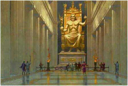 宙斯是希臘眾神之神,為表崇拜而興建的宙斯神像是當時世上最大的室內雕像,宙斯神像所在的宙斯神殿則是奧林匹克運動會的發源地,部份奧運專案就曾經在此舉行.遺址位於希臘西岸奧林比亞(Olympia)的古城中.