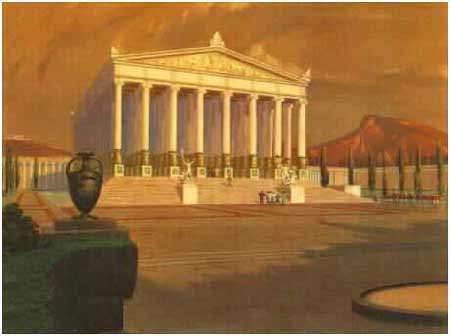 宙斯神殿建於公元前470年,於公元前456年完工,由建築師Libon設計,宙斯神像則由雕刻家Pheidias負責.神殿是以表面鋪上灰泥的石灰岩建成,殿頂則使用大理石興建而成,神殿共由三十四條約高17米的科林斯式(Corinthian)支柱支撐著,神殿的面積達41.1