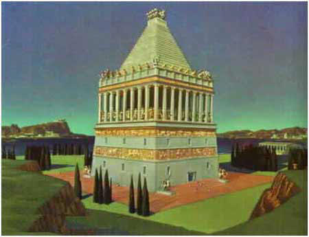 毛索洛斯墓廟位於哈利卡納素斯,在土耳其的西南方,底部建築為長方形,面積是40米(120呎)乘30米(100呎),高45米(140呎),其中墩座牆高20米,柱高12米,金字塔高7米,最頂部的馬車雕像高6米建築物被墩座牆圍住,旁邊以石像作裝飾.頂部的雕像是四只馬拉著一架古代雙輛戰
