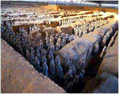 震驚中外的考古發現 1974年,中國考古工作者把沉睡千年的7000多件陶捅發掘出土,被認為是古代的奇蹟,是本世紀最壯觀的考古發現.秦兵馬俑,無論在數量上,品質上,還是在考古發現上,都是世界上所罕見,它對于深入研究公元前二世紀秦代的軍事,政治,經濟,文化,科學和藝術等提供了極為珍貴的實物材料.它既是中國人民的藝術珍品,又是世界人民的共同文化遺產.